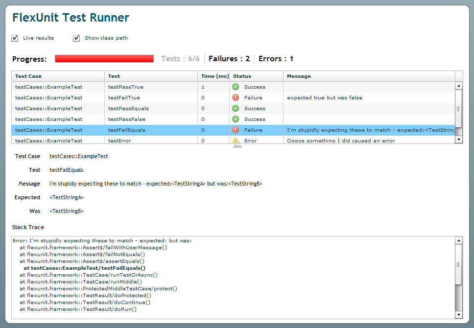 However after a couple of days using the base runner which is provided with FlexUnit I found myself spending a lot more time than I thought I should just looking for the details of the problem in the flex runner. I think that the base runner is not conducive to quickly finding the cause of test failure(s), I believe it is due to the following reasons: